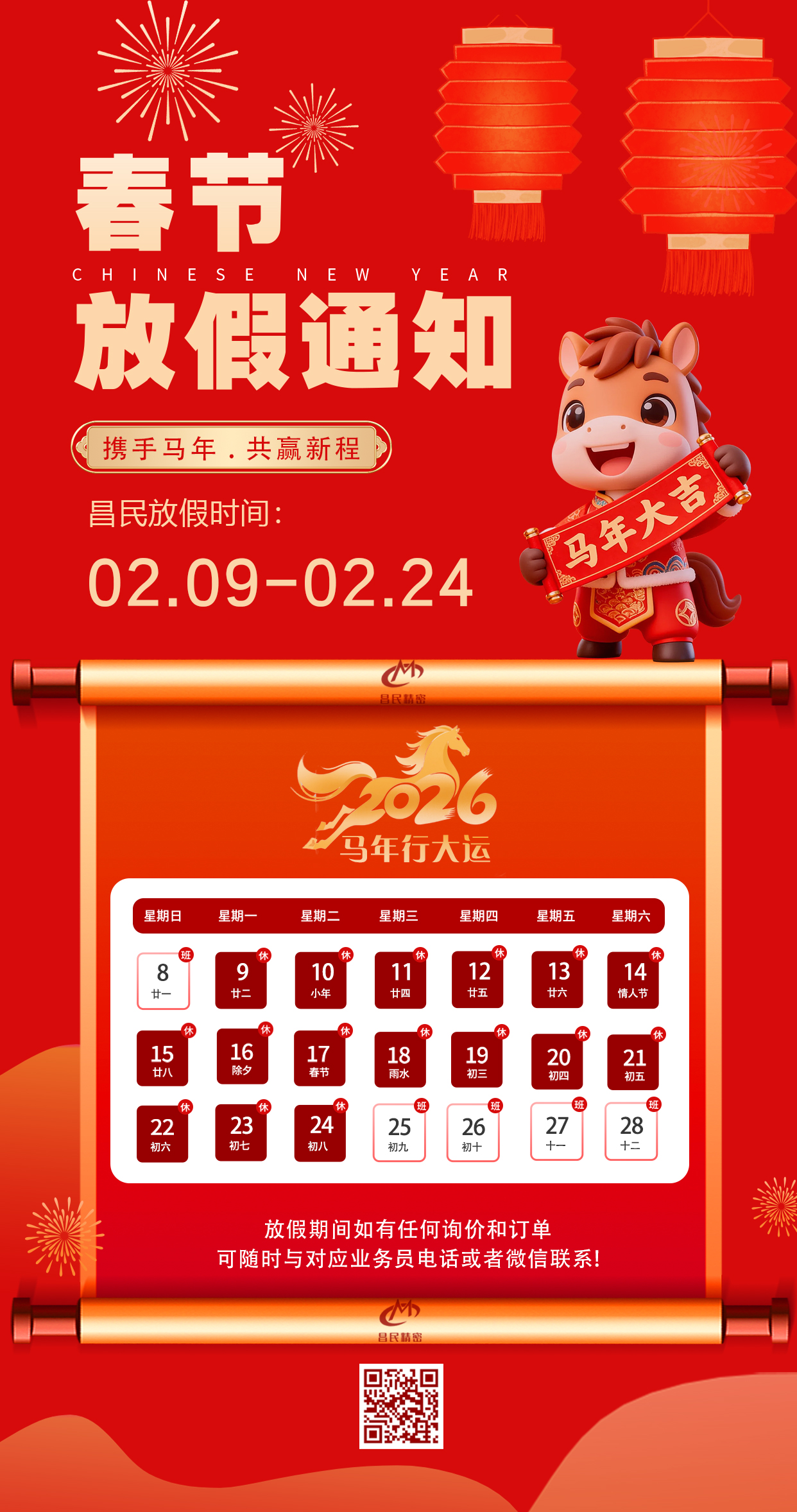 春節(jié)將至,為讓全體員工共度祥和團圓的假期,并結合我司實際情況,現(xiàn)將2026年新春放假安排時間如下:2026年2月8日至2月24日,2月25日(正月初九)正式復工。新歲啟新章,感謝您一直以來的理解與包容,昌民全體祝您新春安康、順遂無憂!新的一年,一起攜手共進、共促發(fā)展!