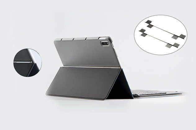皮套轉(zhuǎn)軸,又稱為合頁轉(zhuǎn)軸,是一種關(guān)鍵的結(jié)構(gòu)部件,安裝在皮套內(nèi)部,用于折疊處,能夠?qū)崿F(xiàn)平板電腦的折疊和旋轉(zhuǎn)開合功能。它的作用是保持設(shè)備在固定和旋轉(zhuǎn)時(shí)的穩(wěn)定性。皮套轉(zhuǎn)軸可以使平板電腦在不同角度下保持固定,不會(huì)垂落,滿足不同場景下的觀看需求,提供更好的可視性和操作體驗(yàn)。此外,在轉(zhuǎn)動(dòng)過程中會(huì)有一定的阻尼感,手感非常舒適。帶有內(nèi)置阻尼轉(zhuǎn)軸的折疊支架型平板電腦皮套備受消費(fèi)者喜愛。
